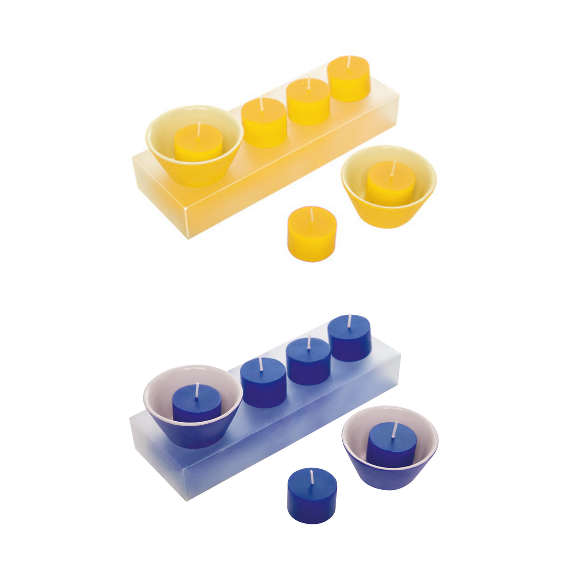 21,8 x 7,5 x 3,5 cm. Set de 6 velas de color y 2 portavelas de cerámica. Presentación en caja transparente de regalo.
